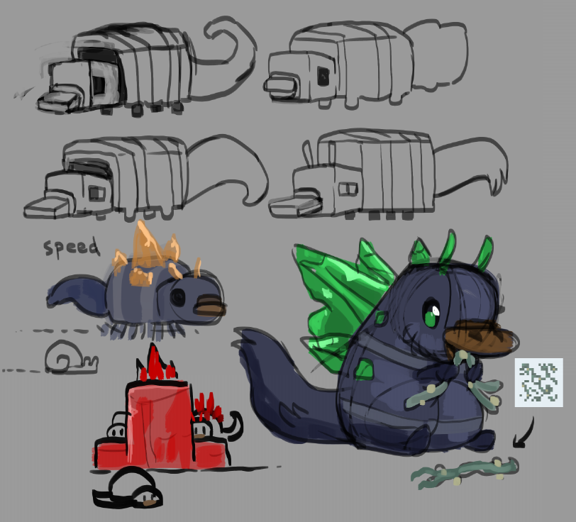 A small, platypus looking, bug animal that makes it's homes near crystal clusters and inside Geodes. You could shear it as a natural way of acquiring crystals passively, or make it follow you as it naturally emits light when sitting (unlike a certain squid). Fluffy tail that sticks up when they are sitting or find a new crystal cluster to rest at They eat Glow Lichen, and are shy creatures that stand near or try to locate crystal places.